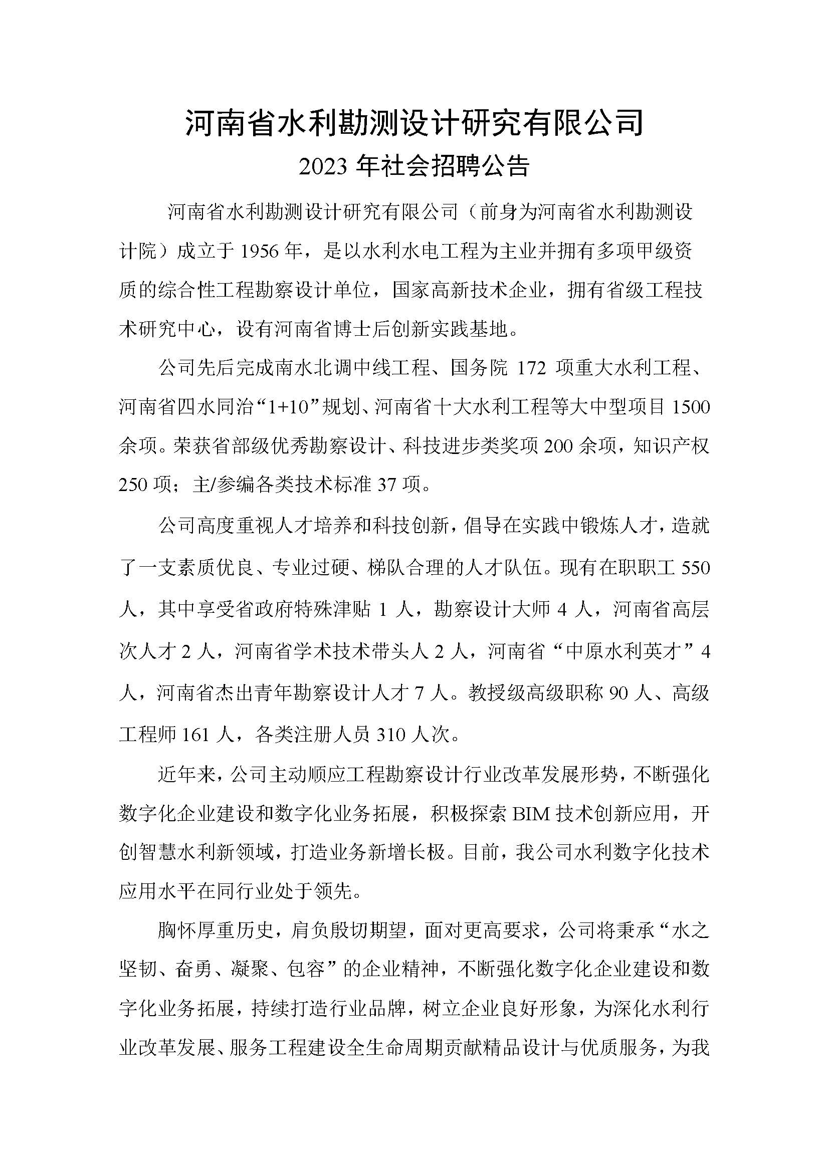 公司于2005年8月在原河南省水利勘測設計院基礎上整體改制而成,現已發展成為以工程勘測、規劃、設計、咨詢為主,集智慧水利、水生態景觀、工程總承包、全過程咨詢、國際工程和項目投資等業務于一體、旨在服務工程全生命周期的綜合性工程公司。